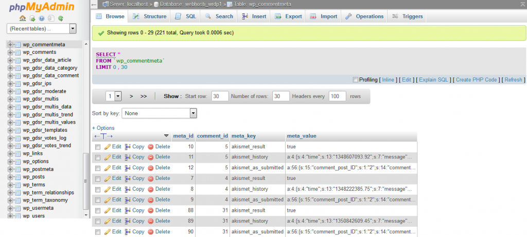 In the structure screen you will see the structure of database’s table. You will see the field name, their data types, collation, attributes etc. You can change the field’s structure as well as delete a field. Also, you can assign indexes i.e. Primary, Unique, Index, Fulltext.