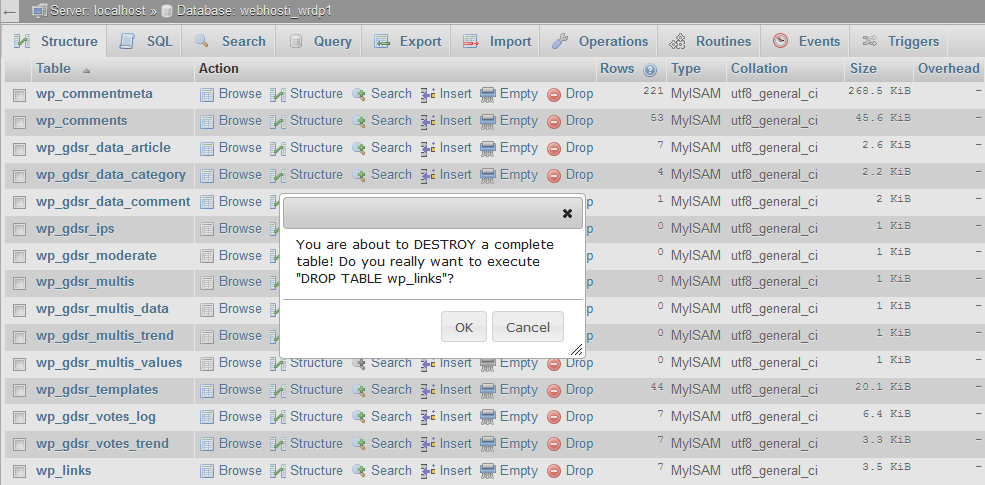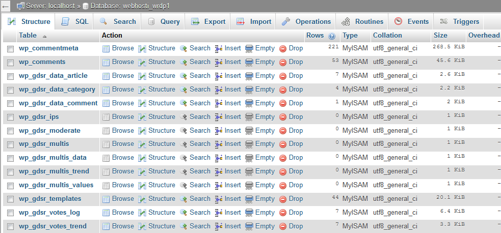 After clicking on the database name, you will see the list of database tables.