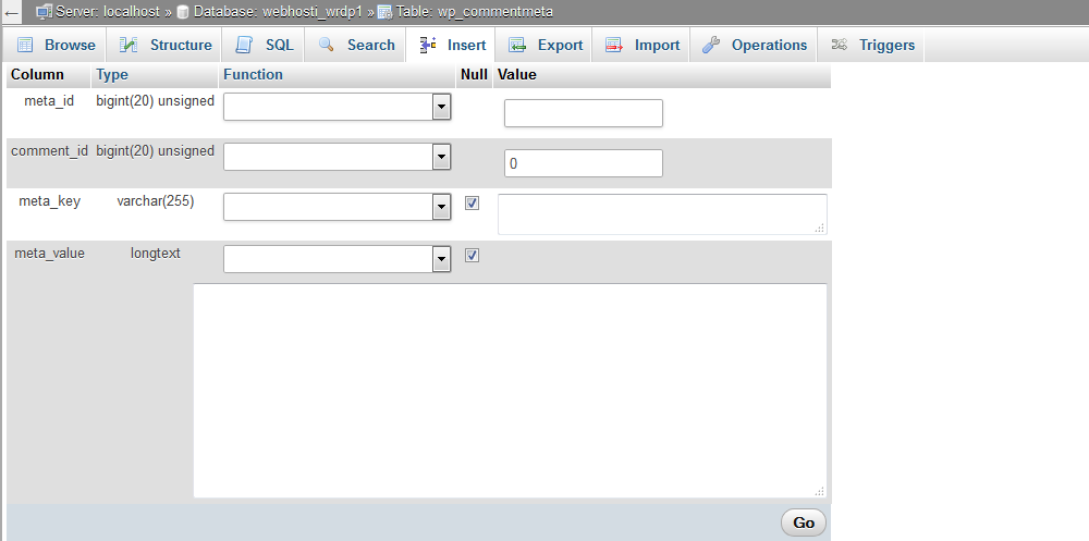 You can insert the records in database table through the Insert action. To insert a new record you need to fill the appropriate values and click on the Go button.