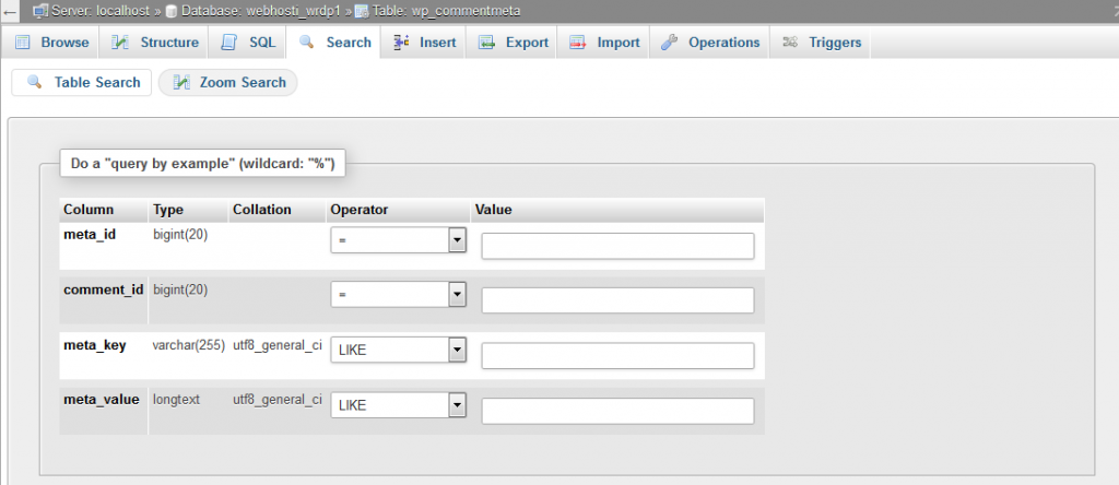 You can create a search query for the selected table by using Search action. Either you can write the WHERE clause or use the “query by example” option. You must click on the Go button to perform search query.