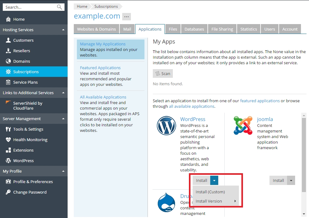 To install an application, go to Applications > Install or Install (Custom) or Install Version.