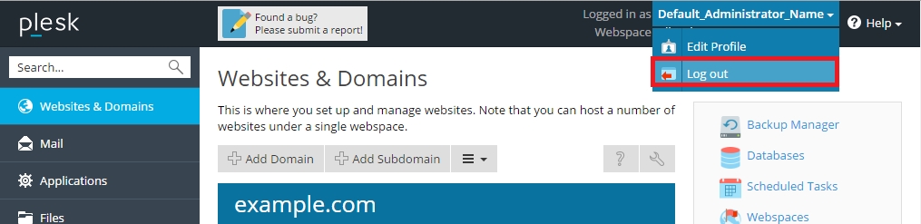 To log out of Plesk, place the mouse pointer over your username located at the top of the page, and click Log out.