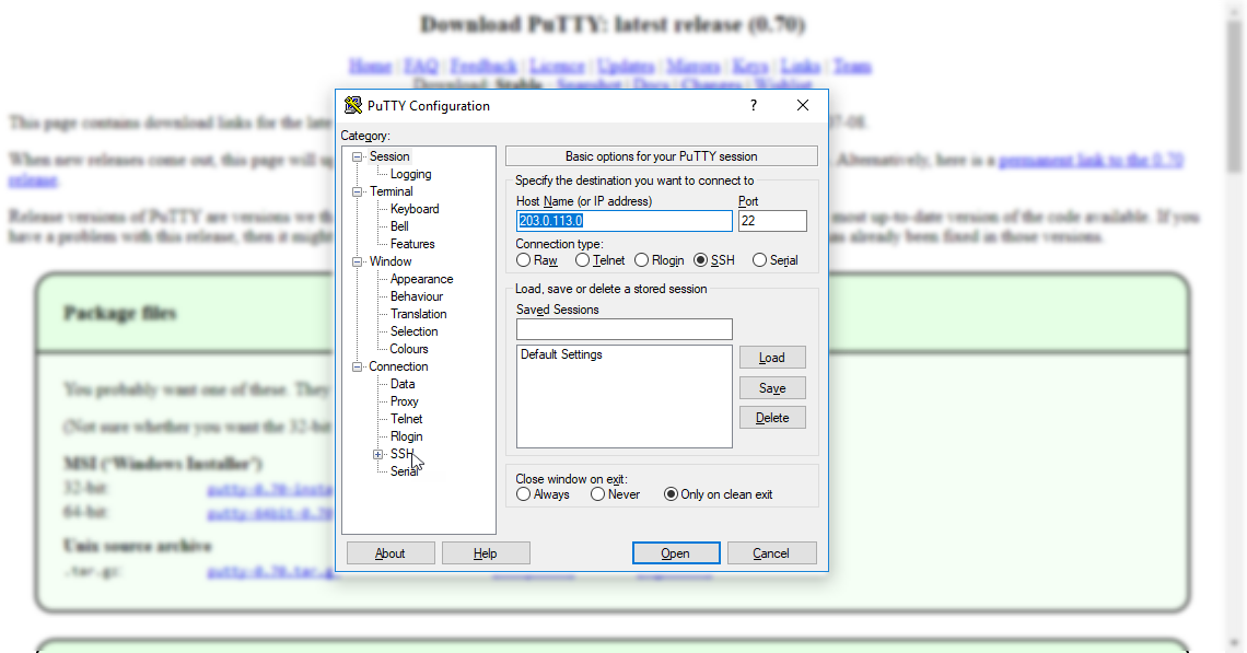 If you don’t have PuTTY installed, visit the Download PuTTY site and choose the Windows installer from the Package files list. Once PuTTY is installed, start the program.