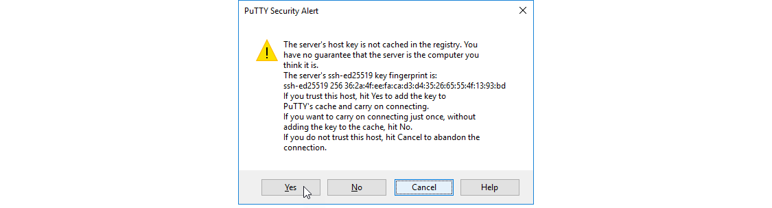 Before you connect to a server for the first time, PuTTY will ask you to confirm that you trust the server. Choose Yes to save the server identity in PuTTY’s cache or No to connect without saving the identity.