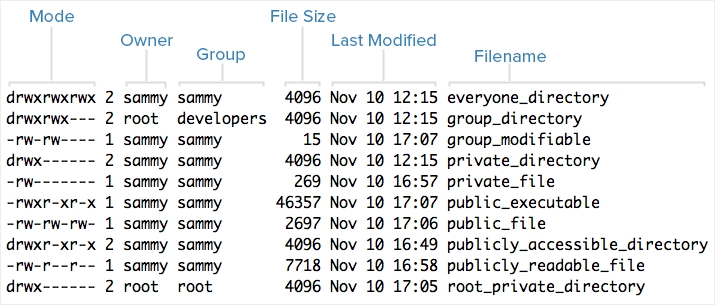 Note that each file's mode (which contains permissions), owner, group, and name are listed. Aside from the Mode column, this listing is fairly easy to understand. To help explain what all of those letters and hyphens mean, let's break down the Mode column into its components.