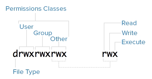 From the diagram, we know that Mode column indicates the file type, followed by three triads, or classes, of permissions: user (owner), group, and other. The order of the classes is consistent across all Linux distributions.
